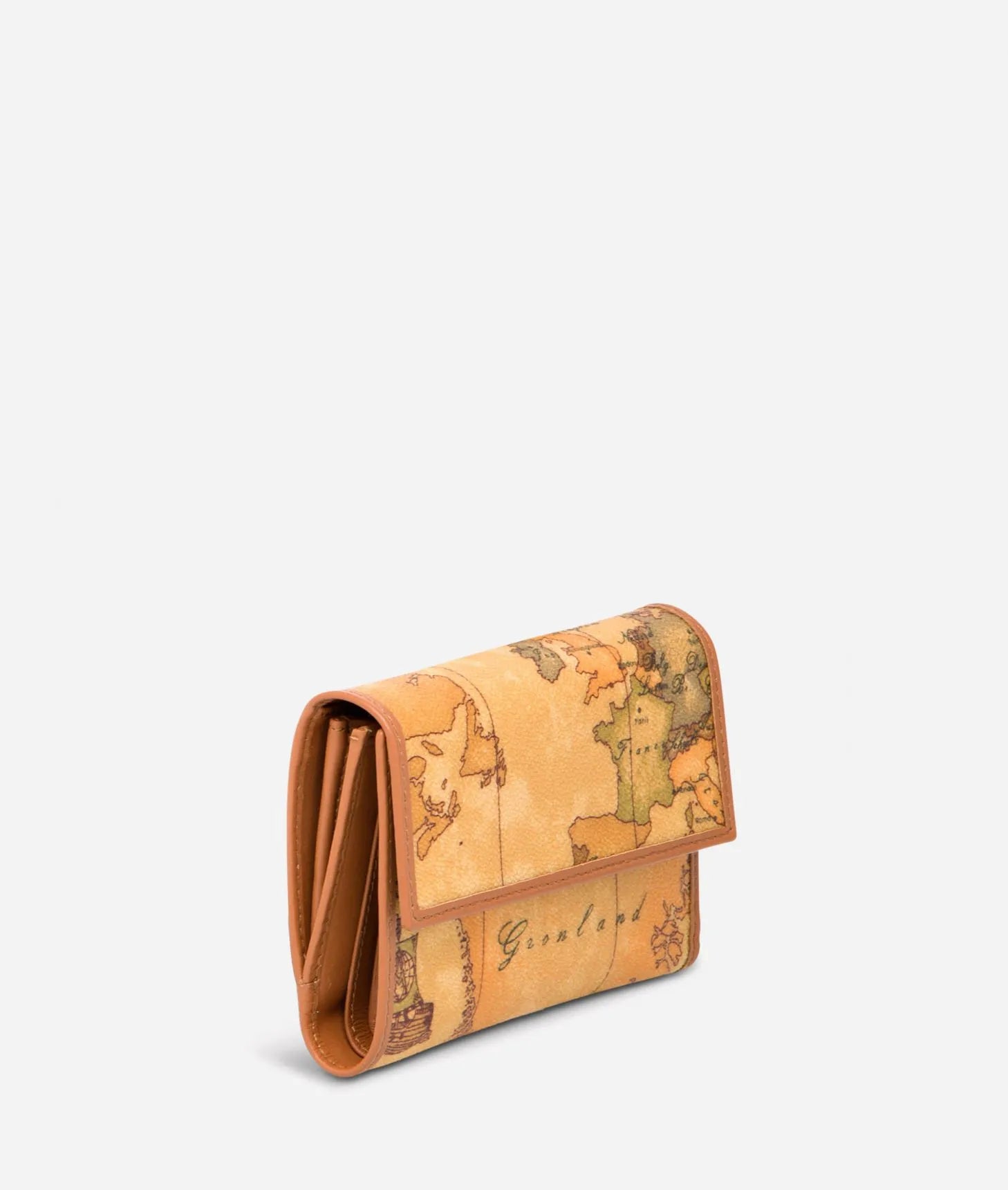 Portafogli donna in tessuto stampato con cartina geografica Geo Classic e dettagli in pelle di vacchetta color cuoio. Ha la chiusura con bottone a pressione, numerose tasche interne per banconote, carte di credito e ricevute, la tasca portamonete con zip. Si farà apprezzare per il suo stile lineare e femminile e per la dimensione media.